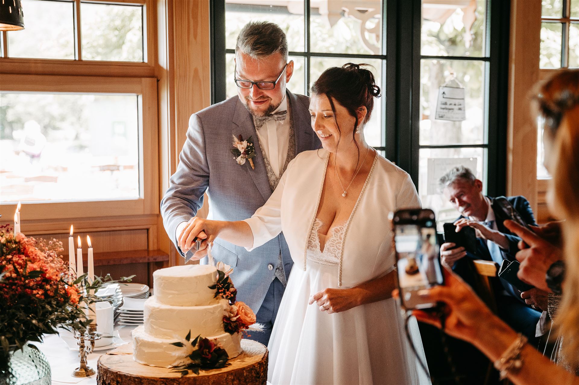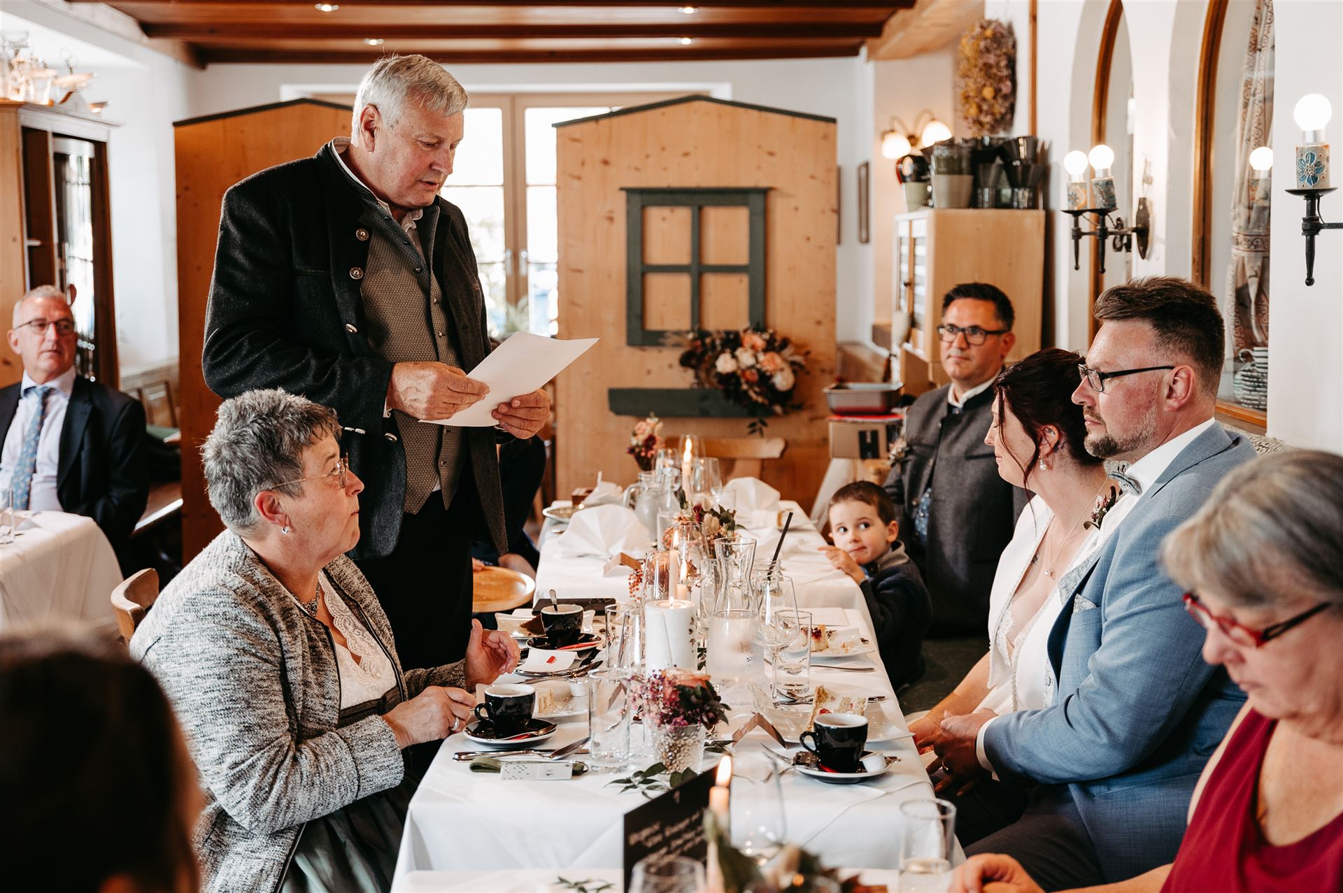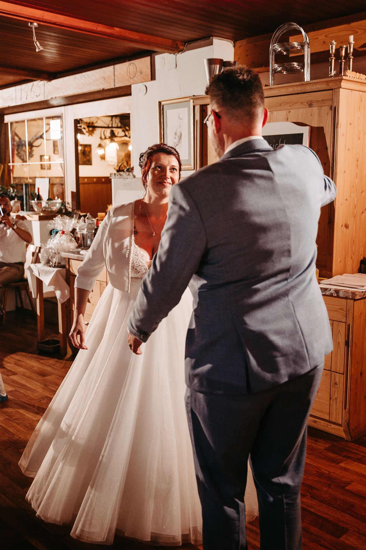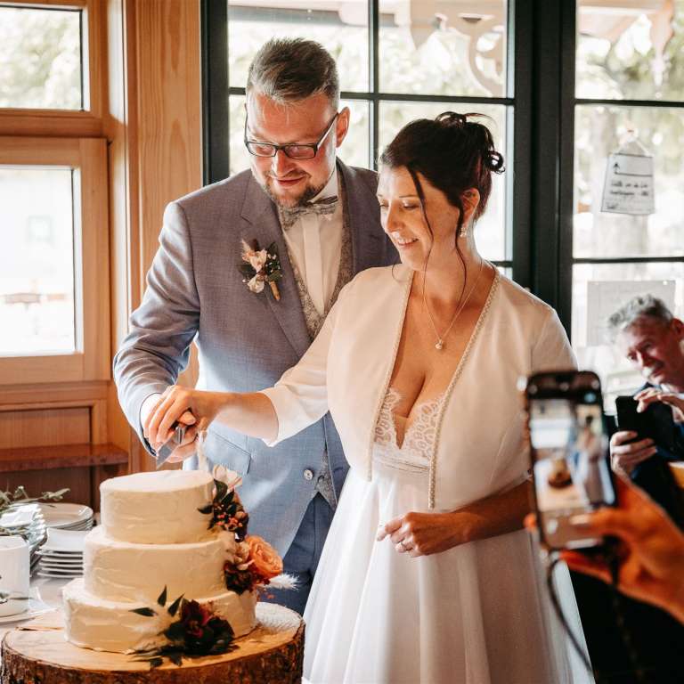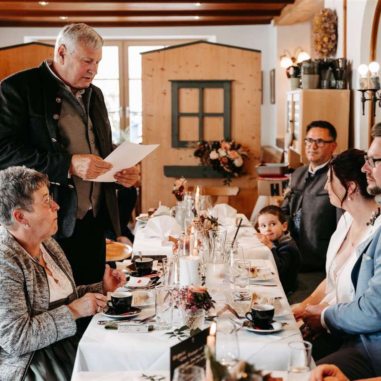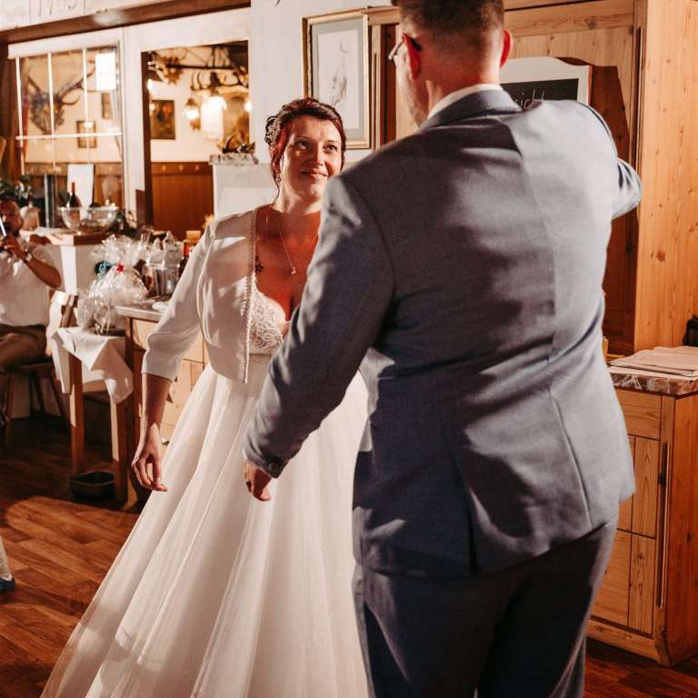 Ab nachmittags wurde im Gamsjaga gefeiert, einem Ort, der für seine herrliche Küche und seine tolle Atmosphäre bekannt ist. Das Essen war ein kulinarisches Highlight, das sowohl das Auge als auch den Gaumen verwöhnte. Doch nicht nur das Essen machte den Abend unvergesslich. Es gab zahlreiche Überraschungen für das Brautpaar, die ihre Liebe und Verbundenheit auf wunderbare Weise feierten. Freunde und Familie hatten kreative und herzliche Beiträge vorbereitet, die für viele Lacher und auch einige Freudentränen sorgten.